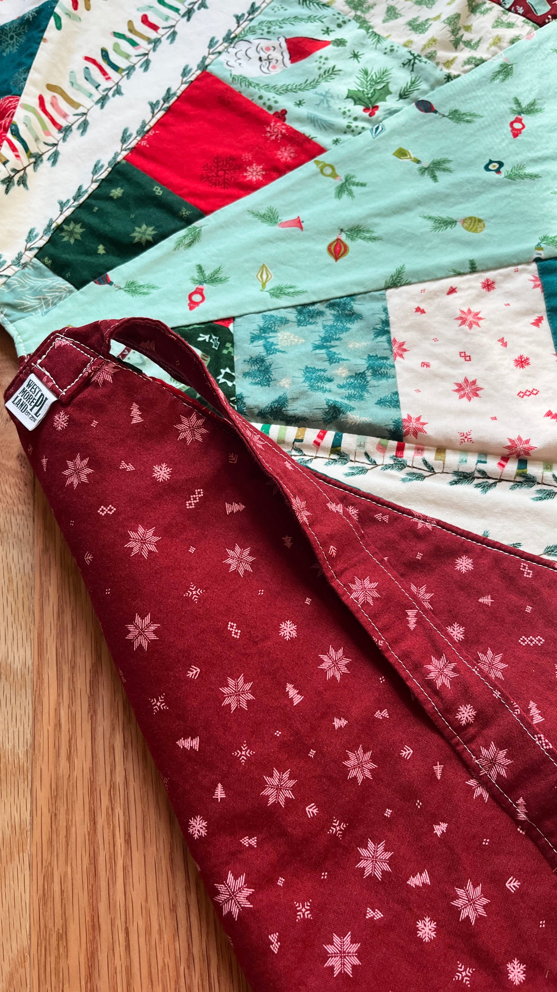Celebrate the holidays with a burst of color and vintage charm! This handmade, quilted tree skirt is a beautiful blend of colorful designer fabrics, curated to evoke a cozy holiday feel. The patchwork design brings a playful yet timeless aesthetic, making it the perfect centerpiece around your Christmas tree.