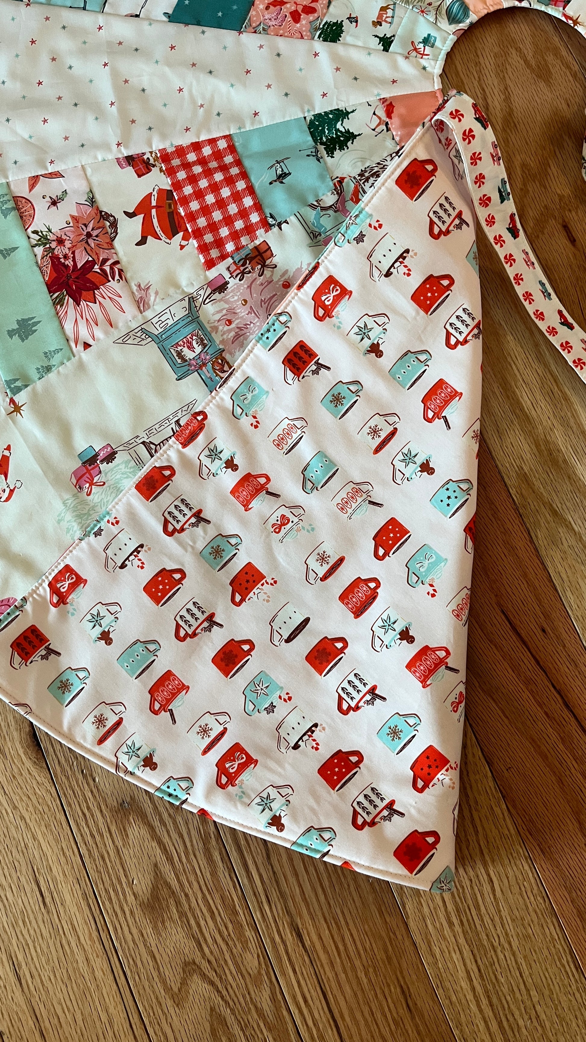 Celebrate the holidays with a burst of color and vintage charm! This handmade, quilted tree skirt is a beautiful blend of colorful designer fabrics, curated to evoke a nostalgic holiday feel. The patchwork design brings a playful yet timeless aesthetic, making it the perfect centerpiece around your Christmas tree.