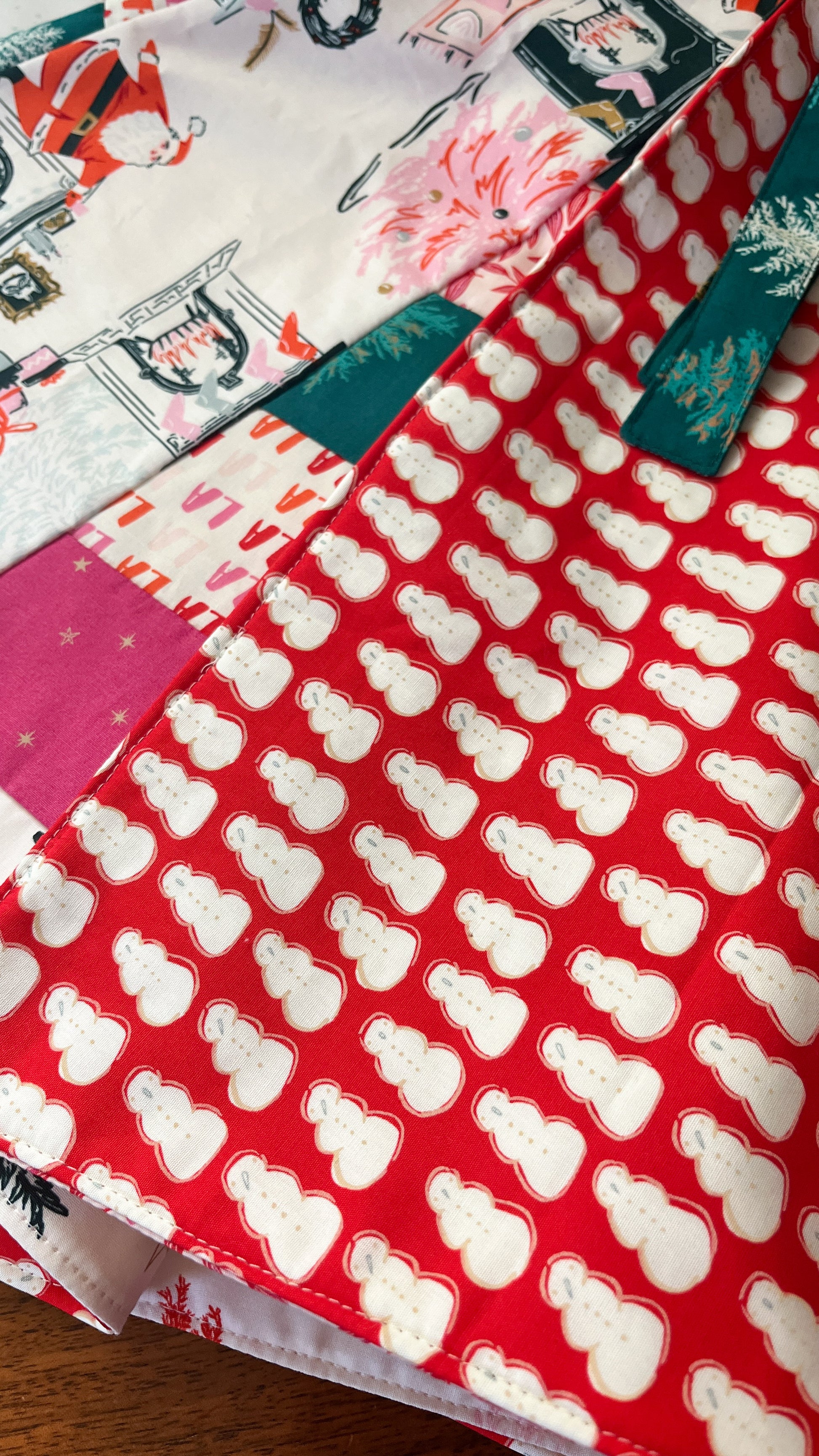 Celebrate the holidays with a burst of color and vintage charm! This handmade, quilted tree skirt is a beautiful blend of bright, nostalgic fabrics, curated to evoke a retro holiday feel. The vibrant patchwork design brings a playful yet timeless aesthetic, making it the perfect centerpiece around your Christmas tree.